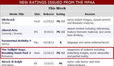 Foi divulgada agorinha a classificação etária de Amanhecer -Part 2 nos EUA. O longa que chega aos cinemas no dia 16 de novembro foi definido para maiores de 13 anos no país. Podem reparar que na maioria dos filmes da franquia foram essa mesma faixa etária, pois de acordo com eles, o filme apresenta sequências de violência, cenas inquietantes e nudez parcial.